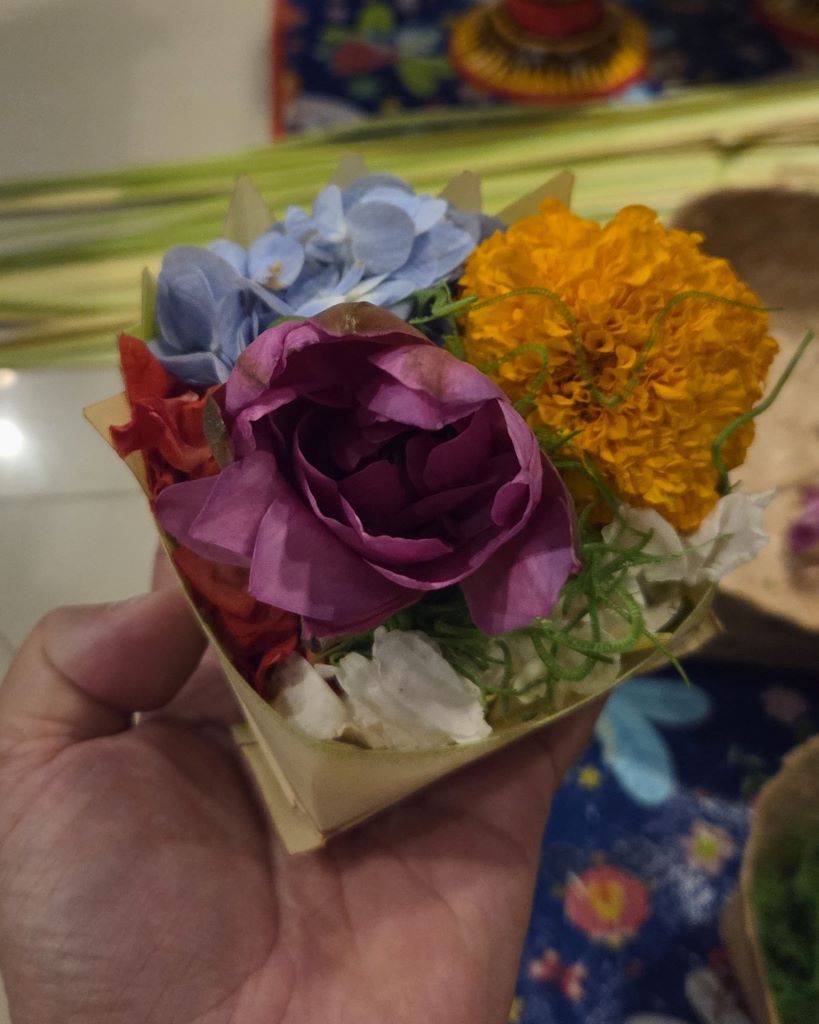 Munan zeigte uns, wie man sie herstellt: kleine Schälchen aus Palmblättern, zusammengenäht mit Bambus, gefüllt mit Blüten.