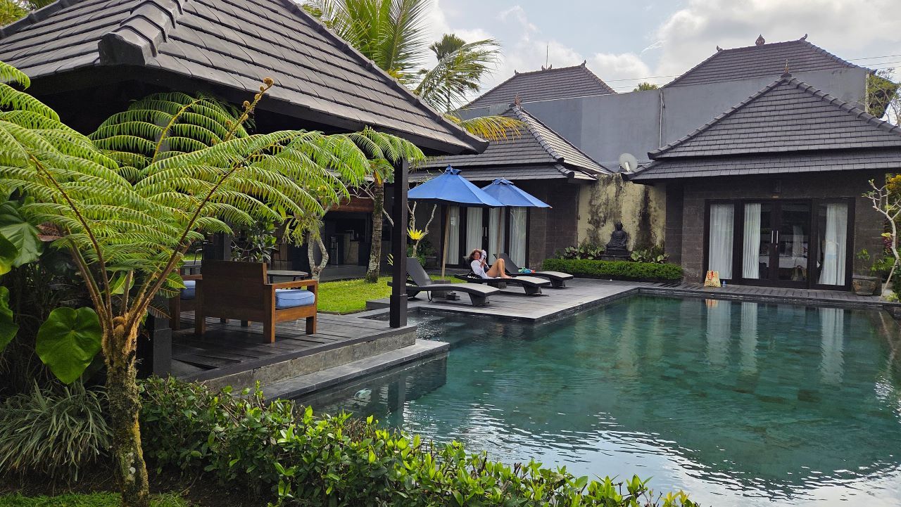 Vier separate Gebäude in einem wundervollen Garten mit Palmen, verbunden durch Steinwege, ein offener Wohn- und Essbereich, umgeben von tropischen Pflanzen rahmten einen gewaltigen Infinity-Pool, der scheinbar direkt in die grünen Reisfelder überging. Am Horizont zeichneten sich die Vulkane Balis ab, eingehüllt in leichten Nebel. Wir konnten unser Glück kaum fassen. Wo ist der Haken? - Doch es zeigte sich: es gab keinen!