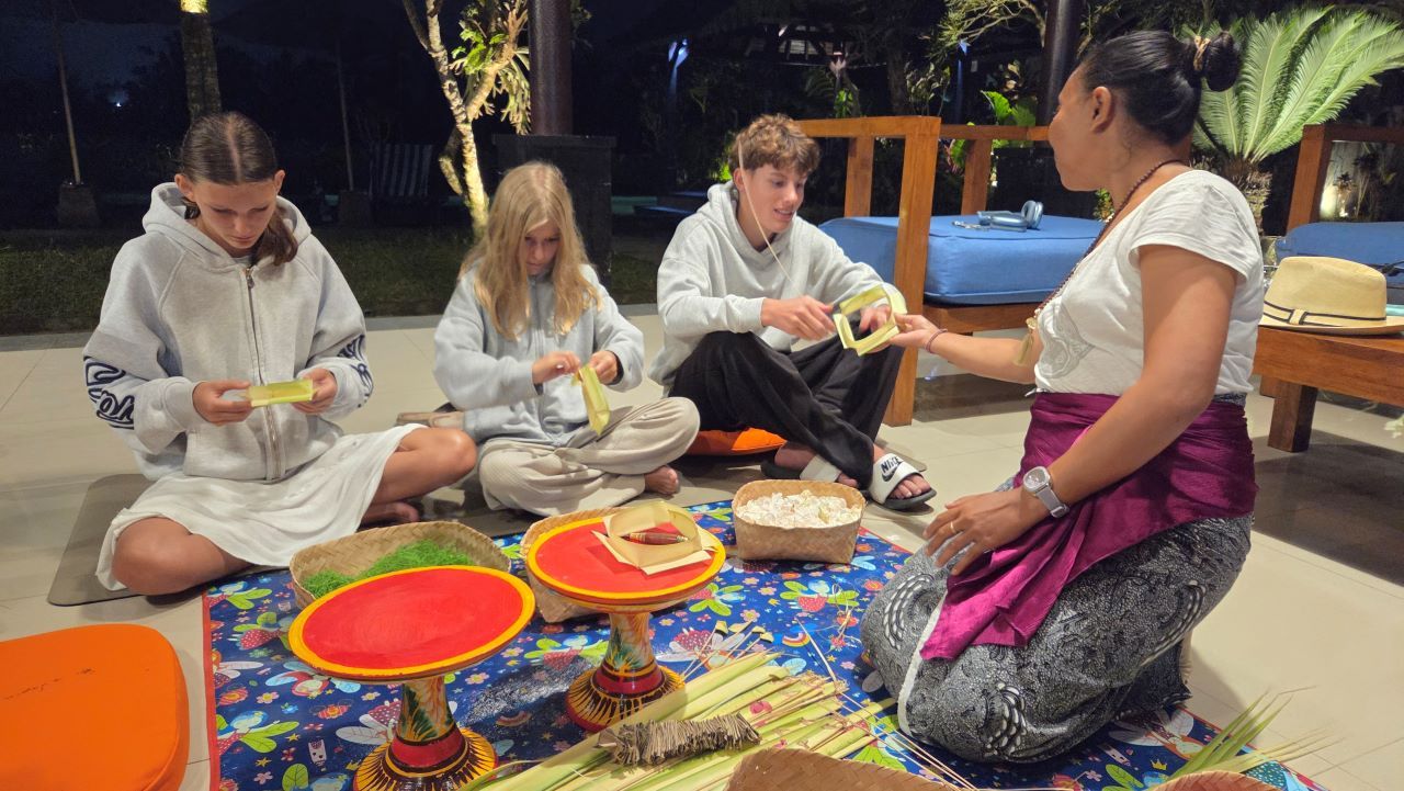 Ein weiterer Abend war den Canang Sari gewidmet, den kleinen Opfergaben, die wir bereits so oft auf Bali gesehen hatten – auf Straßen, in Tempeln und Schreinen, sogar in Autos.