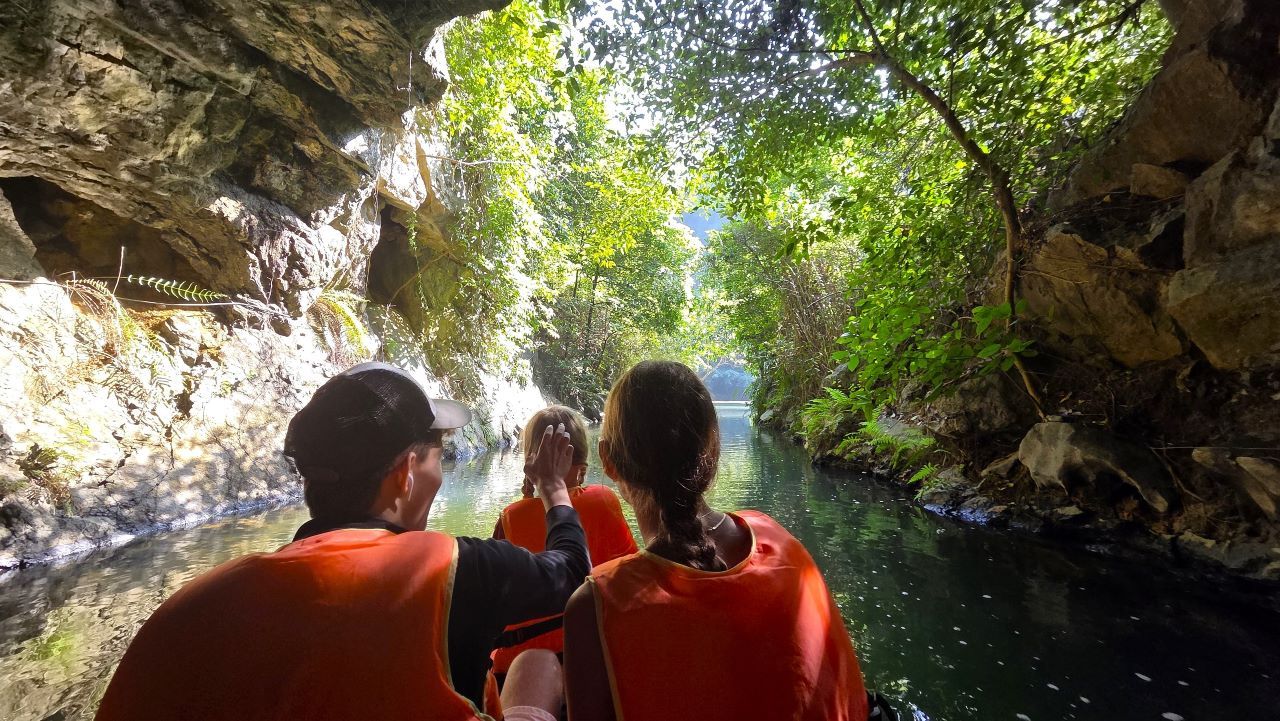 Wir passieren Höhlen – einige kilometerlang und so niedrig, dass wir die Köpfe einziehen müssen –, entdecken Lotusteiche und Tempel, die nur vom Wasser aus zugänglich sind.