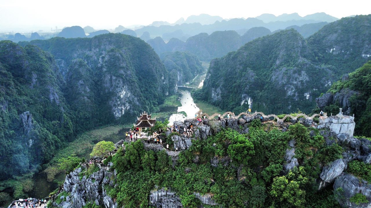 Noch höher thront schließlich die Stupa, von deren Spitze man über die weite Ninh-Binh-Ebene, die Kalksteinfelsen und die Tempeldächer blickt. Wir sparen uns den Aufstieg, machen aber mit unserer Drohne ein paar Luftaufnahmen dieses spektakulären Orts.