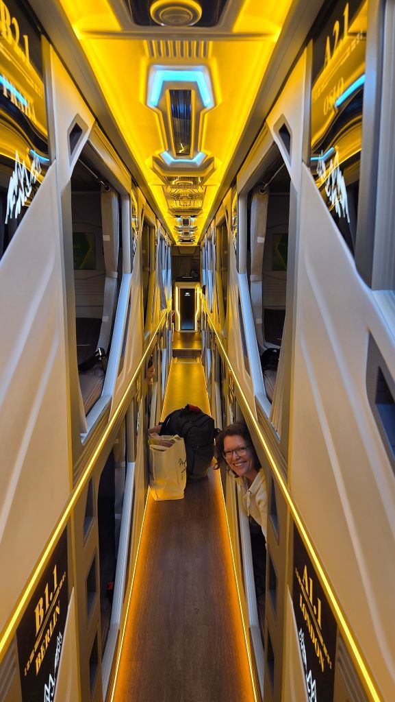 Diese Busse sind ein beliebtes Verkehrsmittel in Vietnam: man reist in separaten Schlafkabinen, die zweistöckig übereinander angeordnet sind: Die Schuhe werden vor dem Besteigen des Busses ausgezogen. Drinnen mutet alles an wie in einem futuristischen Raumschiff. Jede Kabine verfügt über Steckdosen, USB-Anschlüsse, einen Bildschirm und nicht zuletzt: eine Massagefunktio! Wir sind überrascht, wie bequem und komfortabel es ist. Wir haben vier Doppelkabinen gebucht, damit wir alle während der zehnstündigen Nachtfahrt genügend Platz haben.