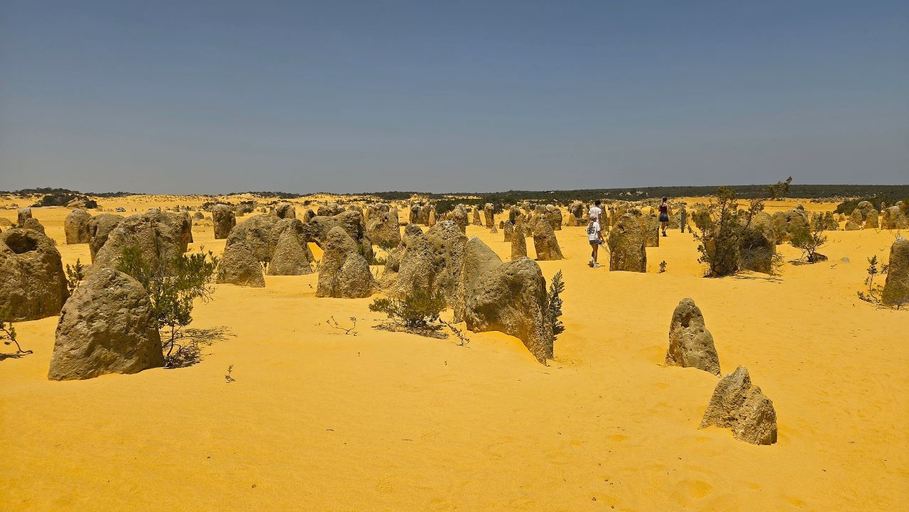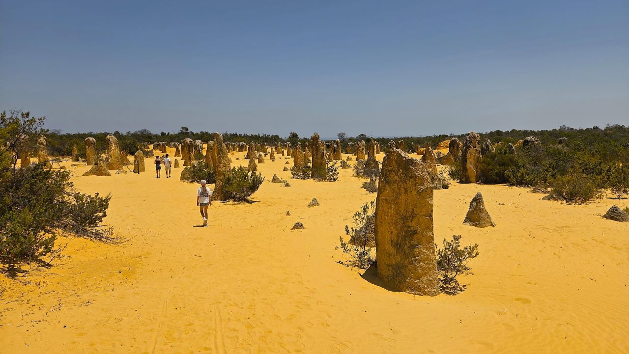 Am nächsten Morgen geht es weiter nach Norden. Wenig später erreichen wir die Pinnacles im Nambung Nationalpark. Tausende bizarr geformte Kalksteinsäulen ragen aus dem gelben Sandboden. Ihre Entstehung ist bis heute nicht vollständig geklärt, vermutlich formten Wind, Wasser und Zeit diese Landschaft über Millionen Jahre. Der Kontrast aus Himmel, Sand und Stein wirkt fast surreal. Wir wandern durch diese bizarre Wüstenlandschaft und sind fasziniert davon, was die Natur alles erschaffen kann.