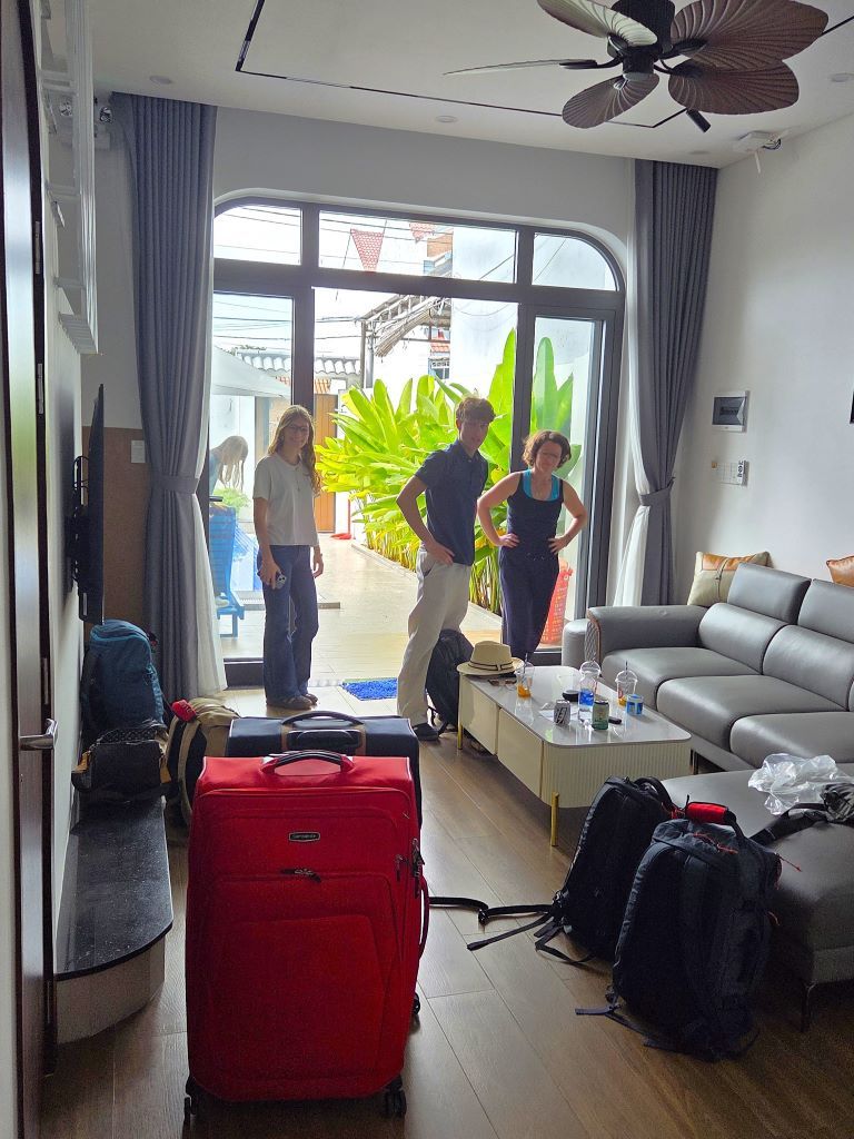 Es wird emotional. Intensiver, als wir es erwartet hätten. Die vergangenen Wochen waren geprägt von Tiefe, Offenheit und einem Miteinander, das im normalen Alltag oft keinen Platz findet. Und weil dieser Ort uns in den letzen Wochen so viel gegeben hat, haben wir eine Entscheidung getroffen: Wir werden zurückkommen nach Hoi An. Und quasi als Versicherung lassen wir einen Koffer bei Chris und Steff – gefüllt mit Kleidung, aber vor allem mit Erinnerungsstücken unserer Reise. Irgendwann holen wir ihn wieder ab.