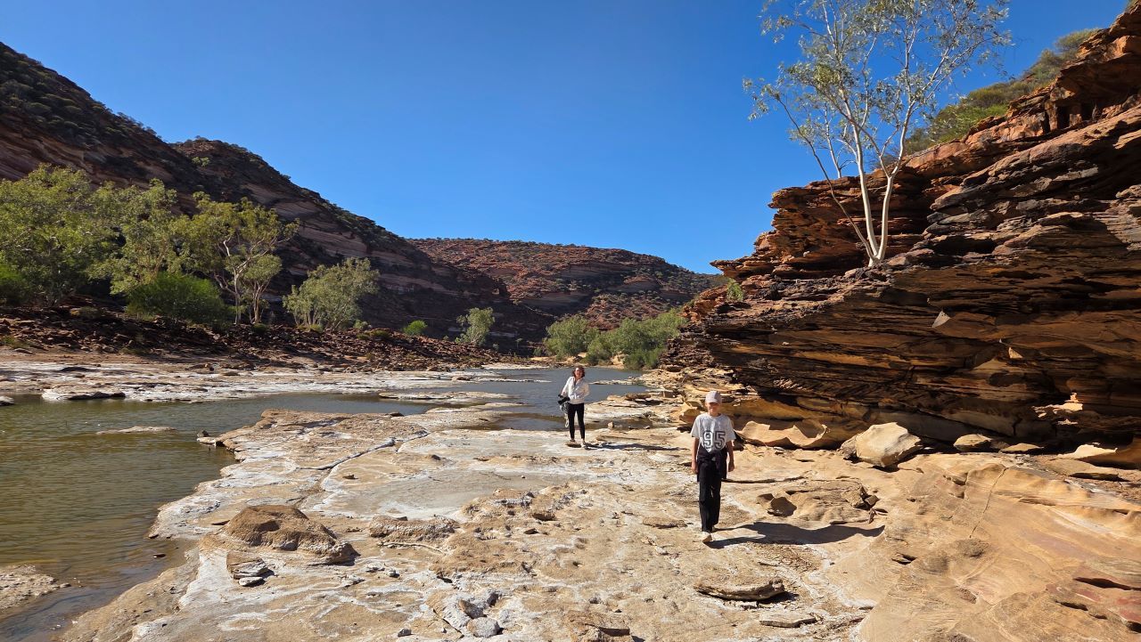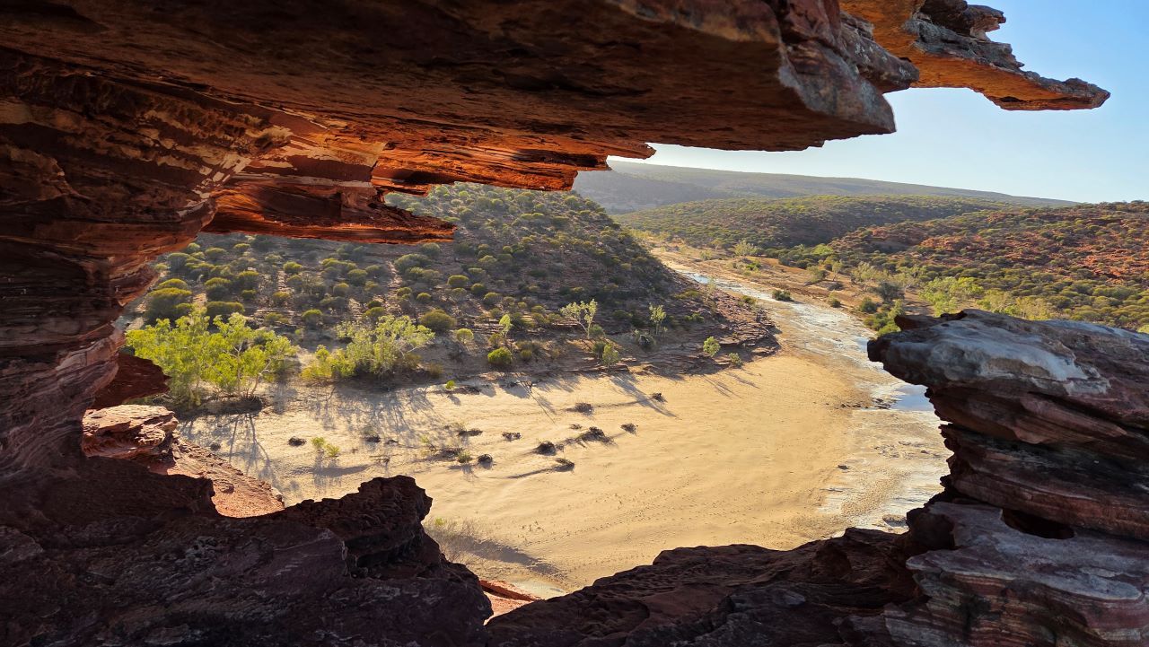 Am nächsten Morgen klingelt der Wecker früh. Wir wollen unbedingt den Loop Walk machen, einen Wanderweg, der beginnend am Nature's Window entlang einer Flussschleife zuerst oben auf den Klippen und dann unten am Flussbett entlang führt. Doch der Weg wird bereits um 7 Uhr morgens geschlossen, weil die Hitze später gefährlich wird. Knapp zehn Kilometer liegen vor uns. Wir haben Wasservorräte und etwas zu essen dabei. Auf dem Track sind wir sind ganz allein. Stille, rote Felsen, das Licht des Morgens. Jeder Schritt fühlt sich sehr intensiv an. Wir lauschen den Geräuschen der Wildnis und bleiben immer wieder stehen, um die grandiose Landschaft zu bestaunen.
