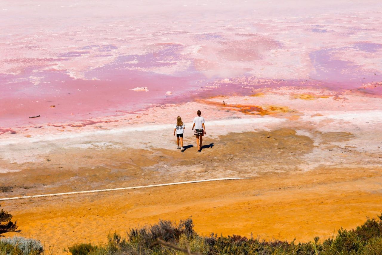 Unser erstes größeres Etappenziel auf unserem Weg nach Norden ist der Kalbarri Nationalpark. Auf dem Weg nach dorthin legen wir einen Stopp an der Hutt Lagoon ein – einem berühmten pinkfarbenen Salzsee. Seine intensive Farbe entsteht durch Mikroalgen, die bei hohem Salzgehalt ein rötliches Pigment produzieren. Je nach Sonnenstand und Salzkonzentration schimmert der See in Rosa-, Lila- und Rottönen. Wir stehen staunend davor, verlieren uns in der Weite und im Farbenspiel.