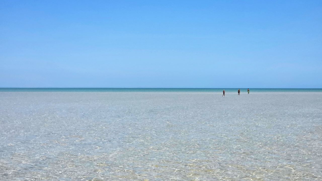Am Hamelin Pool verlassen wir den Highway und fahren Richtung Westen, weitere 100 km. Doch schließlich öffnet sich die Landschaft, Buchten tauchen auf, türkisfarbenes Meer. Endlich erreichen wir den Shell Beach. Hier machen wir erstmal eine lange Pause. Der Shell Beach ist ein Strand, der vollständig aus Milliarden winziger Herzmuscheln besteht. Über Jahrtausende haben Strömungen sie hier abgelagert. Der Strand ist mehrere Kilometer lang, das Wasser knietief, warm – aber zum Schwimmen zu flach. Also waten wir hunderte Meter weit durch das Wasser und lassen die Weite, das Farbenspiel aus strahlendem Weiß und grellem Türkis und die Einsamkeit auf uns wirken.