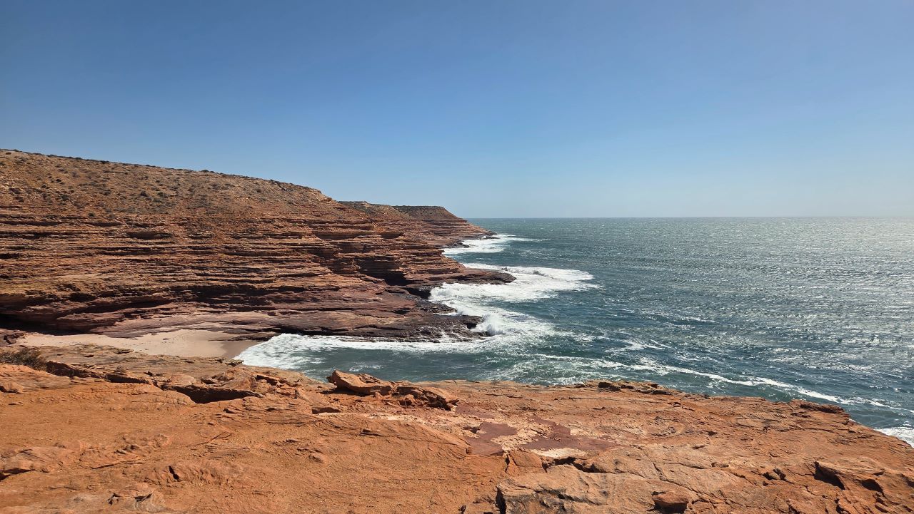 Dann erreichen wir die zerklüftete Küstenlandschaft des Kalbarri Nationalpark – eines der landschaftlichen Highlights unserer bisherigen Reise. An der Küste haben Wind und Wellen eine unwirtliche Felslandschaft erschaffen. Im Hinterland hat der Murchison River über Millionen Jahre hinweg einen tiefen Canyon in das rote Gestein geschnitten. Wind und Wasser haben Schluchten, Klippen und Aussichtspunkte geformt, die uns sprachlos machen.