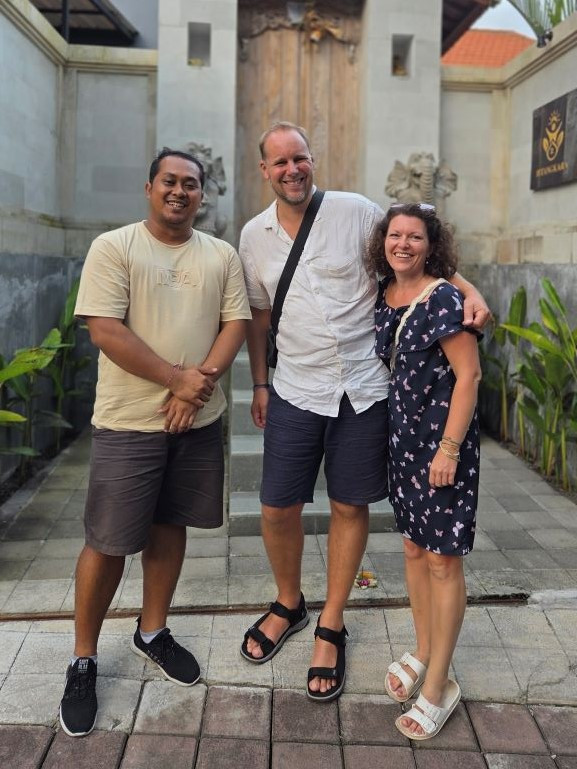 Made, unser Vermieter, begrüßte uns mit einem strahlenden Lächeln und brachte uns ein Begrüßungsgetränk. Sein Lachen war warm, sein Wesen ruhig. Er bot an, am Abend für uns zu kochen – und während wir im Pool schwammen, bereitete sein Team ein balinesisches Abendessen für uns zu. Einfach aber gut: Reis und Nudeln, Gemüse, Hähnchen.