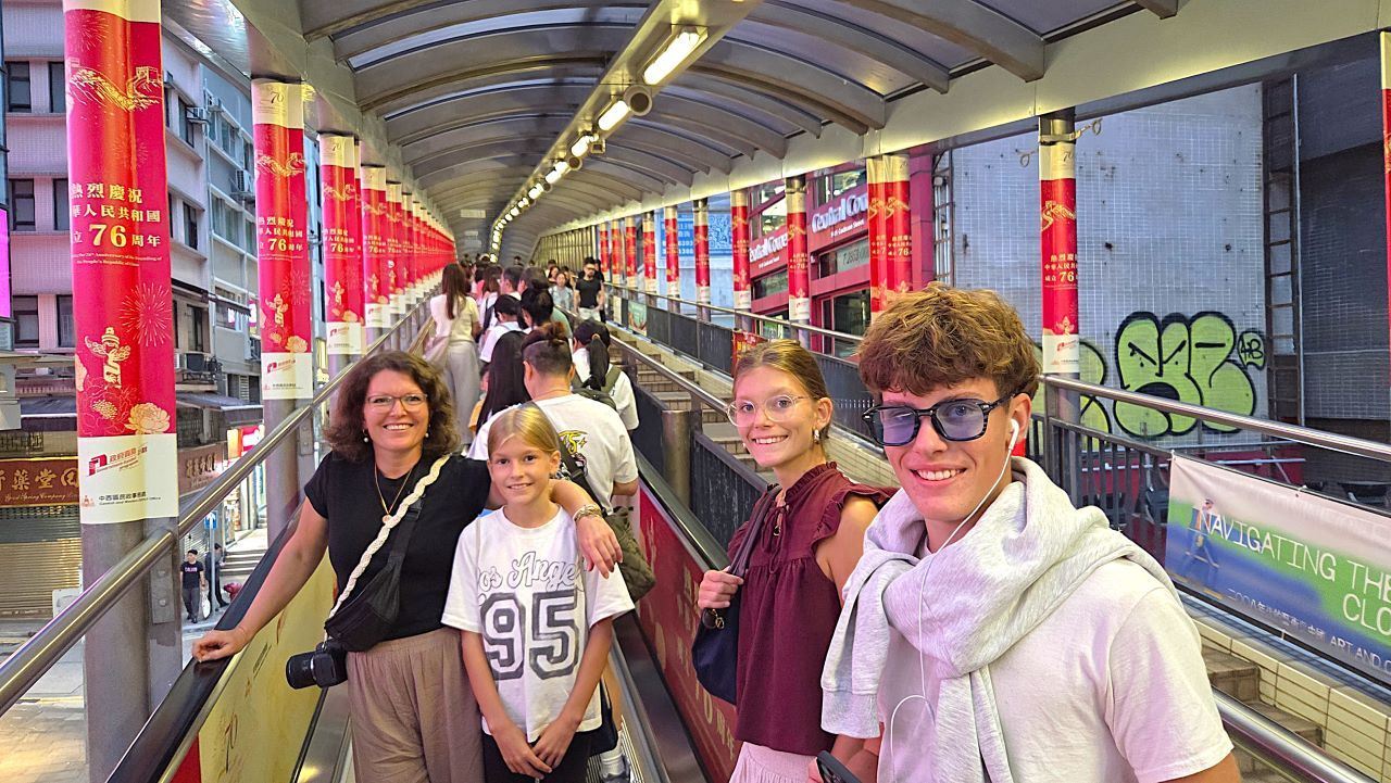 Unser erster Weg führt uns nach Hong Kong Central, das westlich geprägte Herz der Stadt auf der gleichnamigen Insel. Schon die Fortbewegung ist hier eine Erfahrung für sich: Der Fußgängerverkehr läuft auf einer zweiten Ebene über der Straße – überdachte Brücken, Rolltreppen, gläserne Korridore, die sich zwischen den Gebäuden hindurchschlängeln. Man bewegt sich fast schwebend über den Straßenverkehr, wie in einem futuristischen Ameisennetz, das Malls, Banken und Hochhäuser miteinander verbindet.