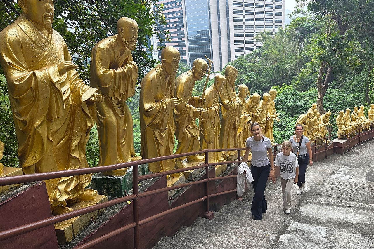 Ein steiler Weg führt hinauf – gesäumt von goldenen Buddhafiguren, jede einzelne anders. Manche lächeln, manche meditieren, manche halten Blumen, Tiere, Schriftrollen. Oben angekommen, öffnet sich ein Klosterkomplex, erfüllt vom Duft brennender Räucherstäbchen, durchzogen von leiser Musik. Das Hauptgebäude ist eine goldverzierte Tempelhalle. In einem gläsernernen Schrein sitzt im Lotussitz der Klostergründer Yuet Kai, dessen sterbliche Überreste auf wundersame Weise mumifiziert sind und als unvergänglich gelten. Die Wände der Tempelhalle sind voller Nischen mit kleinen Buddhastatuen. In Wahrheit sind es nicht zehntausend, sondern über 13.000 Buddha-Statuen – jede ein Ausdruck stiller Andacht. Von der Terrasse blicken wir über ein Meer aus Hochhäusern, das sich bis zum Horizont zieht.
